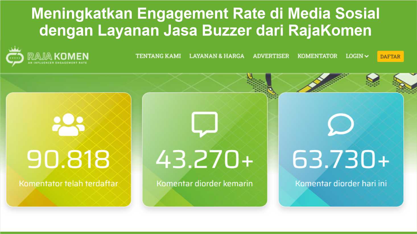 RajaKomen adalah sebuah situs marketplace dengan sistem terbuka yang menawarkan berbagai layanan media sosial untuk kebutuhan branding dan buzzer. Layanan yang ditawarkan meliputi Jasa Komentar di Semua Media Sosial, Kampanye Posting, Jasa Registrasi / Isi Survey, Jasa Download Aplikasi Android, Jasa View, Tambah Subscribers/Followers Real Humans, Jasa Polling/Vote/Like, Jasa Review, Rating Titik Lokasi Gmaps, Jasa Share Sosial Media, Keywords Suggestion, dan masih banyak lagi. Harga yang ditawarkan sangat terjangkau dan memberikan nilai yang luar biasa untuk uang Anda.